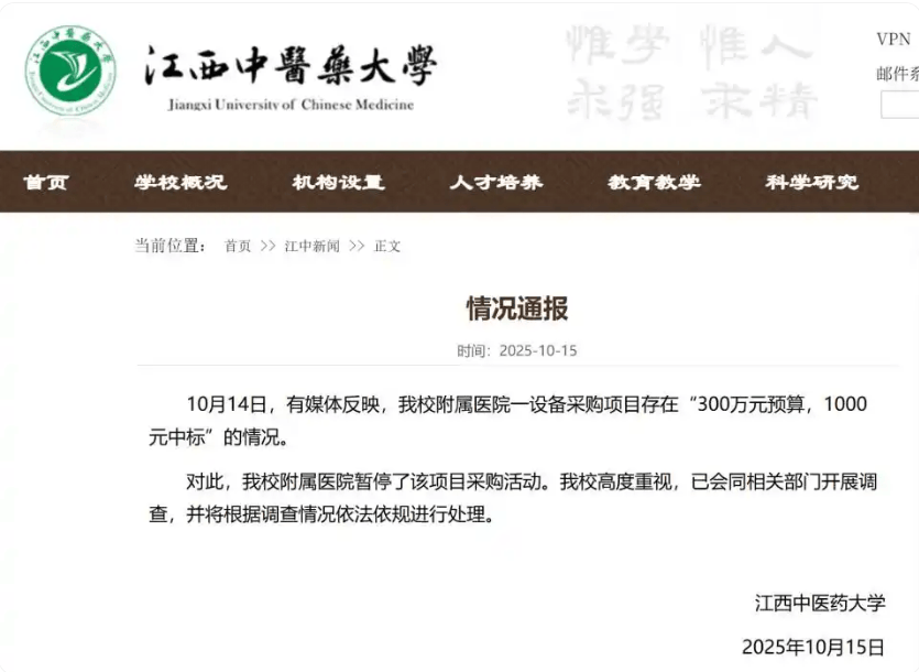 面对巨大的社会质疑,江西中医药大学迅速发布情况通报:暂停该项目的采购活动,并已会同相关部门开展调查。