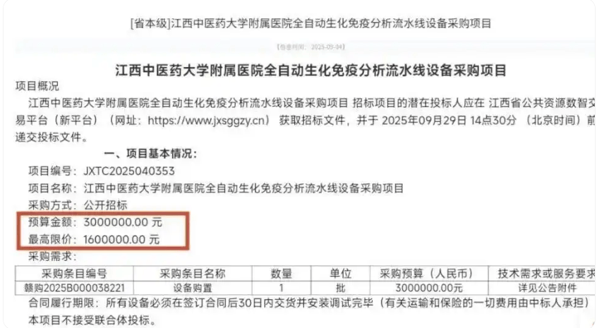 近日,一则医疗设备采购的中标公示,像一颗重磅炸弹,瞬间引爆了舆论场和整个医疗圈。江西中医药大学附属医院的一个采购项目——全自动生化免疫分析流水线设备,预算金额高达300万元,最高限价也定在了160万元。然而,最终的中标结果却令人瞠目结舌:中标价格,竟然只有区区1000元人民币!