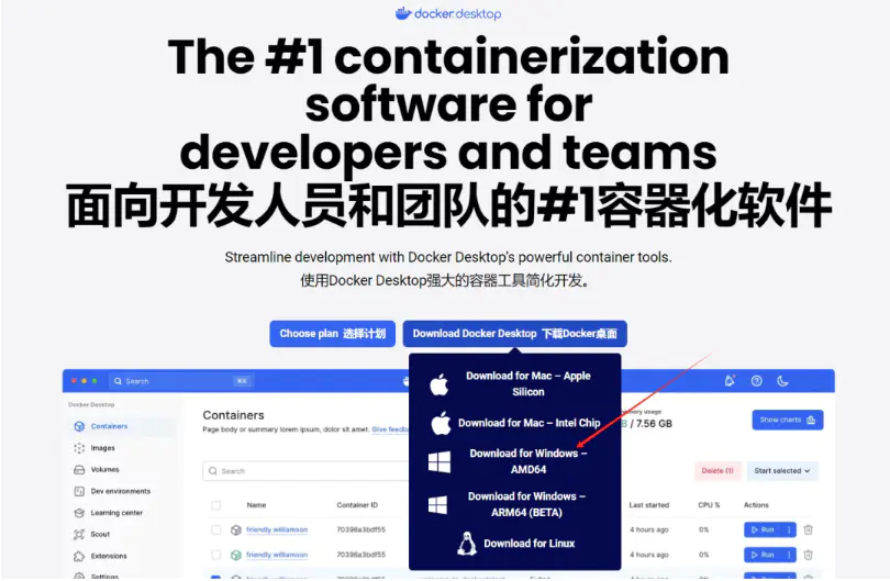 docker desk官网下载适合自己电脑的版本,这里我选择windows amd64!