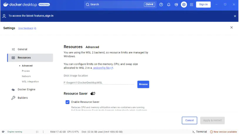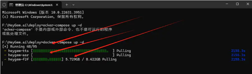 安装heygem需要拉取3个镜像,如果你的c盘没有100G,建议将镜像储存在其他位置即在docker desktop中的设置按钮——resources —-disk image location(磁盘镜像储存),镜像大约70G所以你选择的磁盘建议100G。