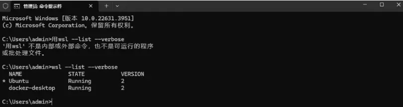 用wsl –list –verbose命令可以查看本机有没有安装过wsl,如下图就是已经安装过,无需再安装