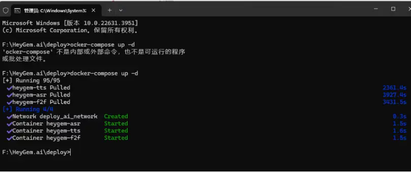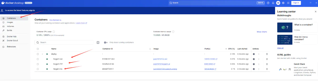 下次打开的时候,直接先打开docker desk 选择containers,运行刚才拉取的三个镜像,点进去heygem官方界面就可以玩转免费数字人了!